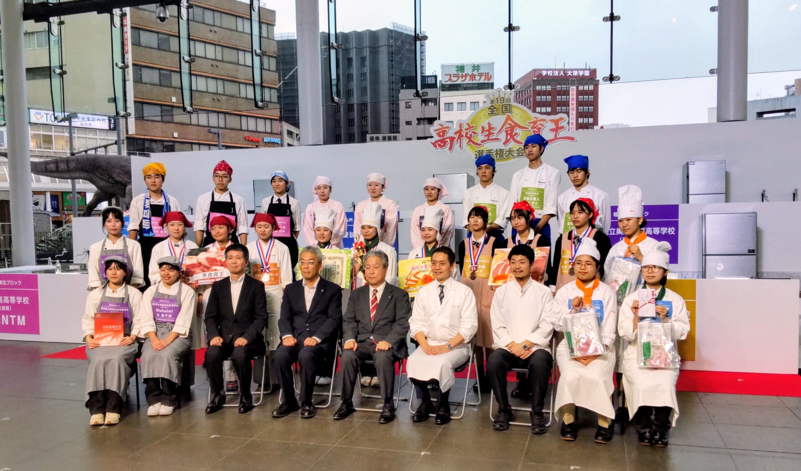 福井駅での大会開催、テレビカメラもある中、緊張しながらも3人で全力で取り組むことができました。中でも、高校1年生の岡君が「大根のかつらむき競技」では、普段の練習の成果を発揮し、5分間で168㎝の記録を出し、見事1位となりました!