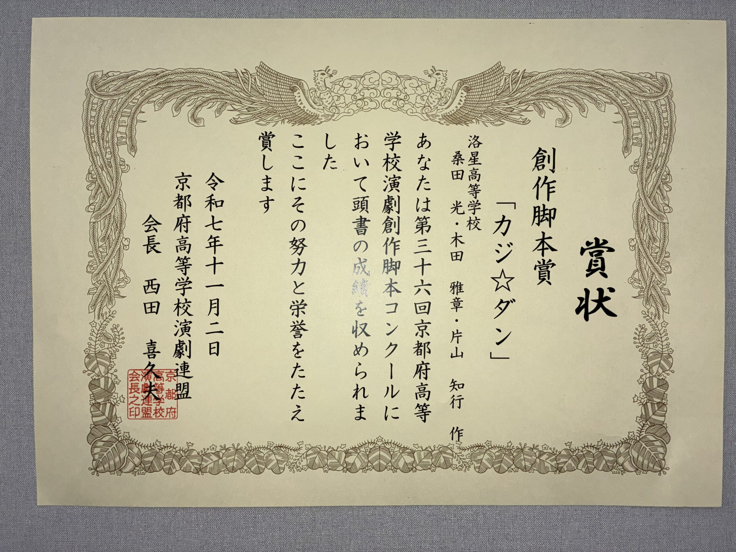 上演は上位大会に進めませんでしたが、脚本は評価され、近畿高等学校演劇協議会が主催する「創作脚本コンクール」に推薦されました。